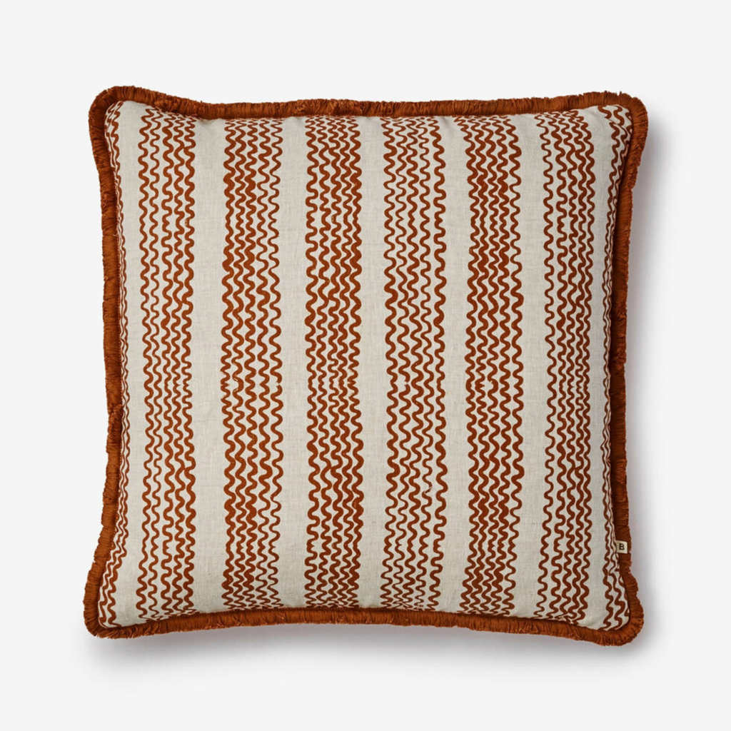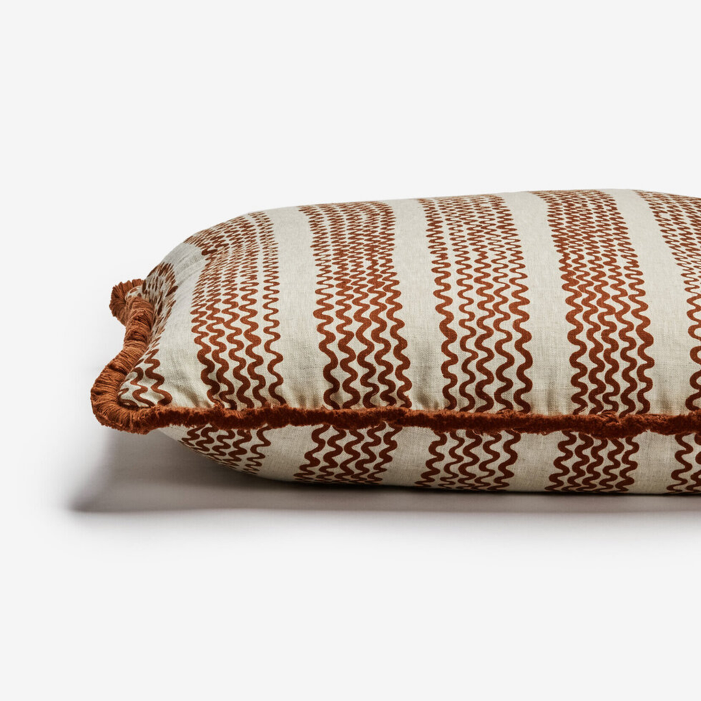 A crisp white base with soft cocoa stripes gives this linen cushion a coastal feel. Its hand-drawn brown lines add subtle texture and movement to everyday styling.