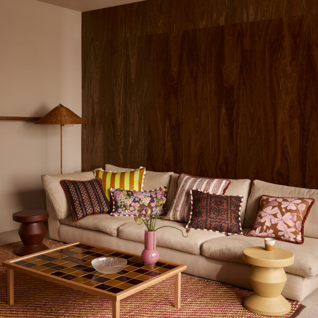 From In The Garden collection, this 60cm cushion is finished with a brown fringe cotton trim and includes an ethically sourced plush feather insert.