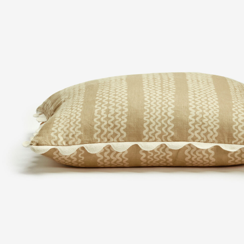 A linen cushion with a soft wheat-coloured stripe on a neutral base, inspired by sun-bleached textiles and coastal calm. A breezy, versatile piece that brings gentle movement to your space.