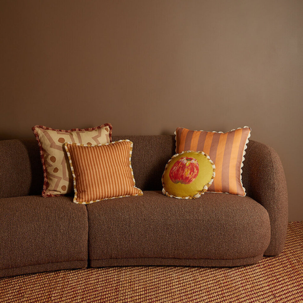 A nutmeg linen cushion featuring our Pinstripe design, with fine lines and graphic rhythm for a grounded yet expressive look. A warm brown neutral that complements bold patterns or works in tonal styling.  Includes an ethically sourced plush feather insert.