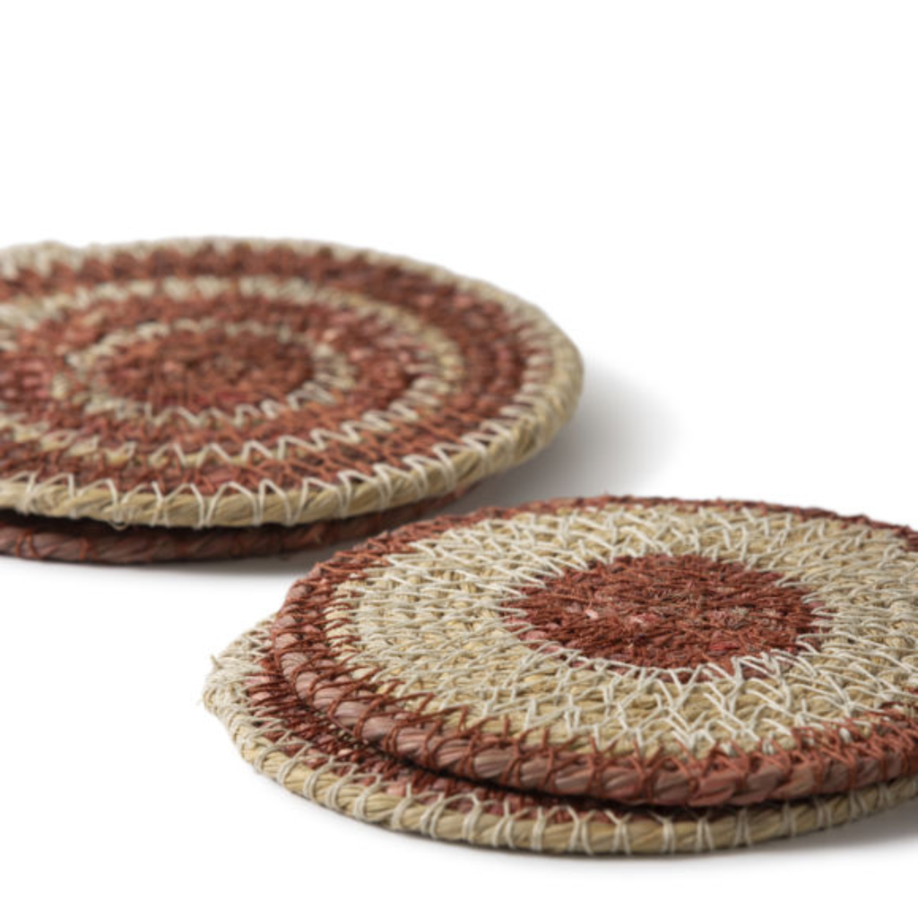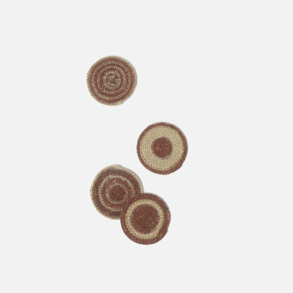 Bring natural charm to your table with the Agora woven coasters. The four-piece set showcases unique two-tone circular designs, each with playful variations in width and spacing. Handwoven in India from natural seagrass, they bring artisanal craftsmanship and an organic texture to everyday dining.
