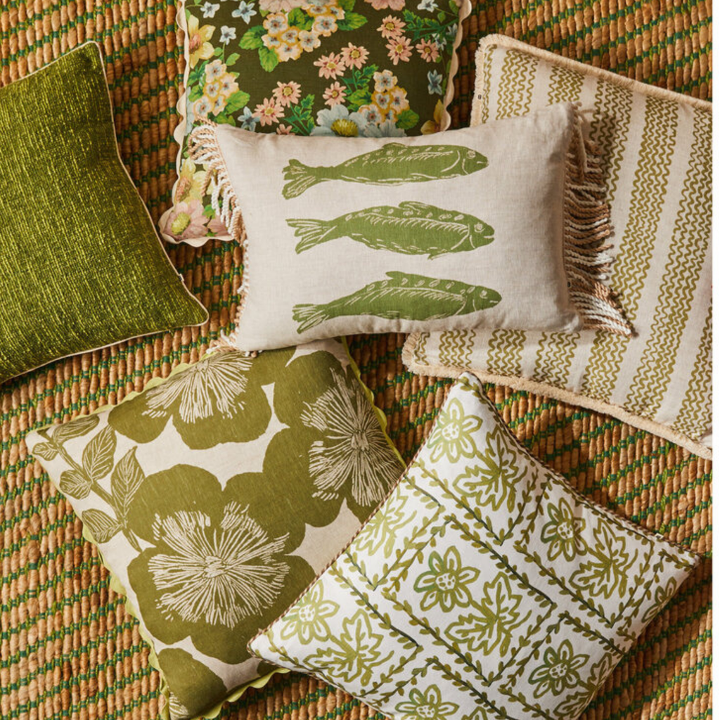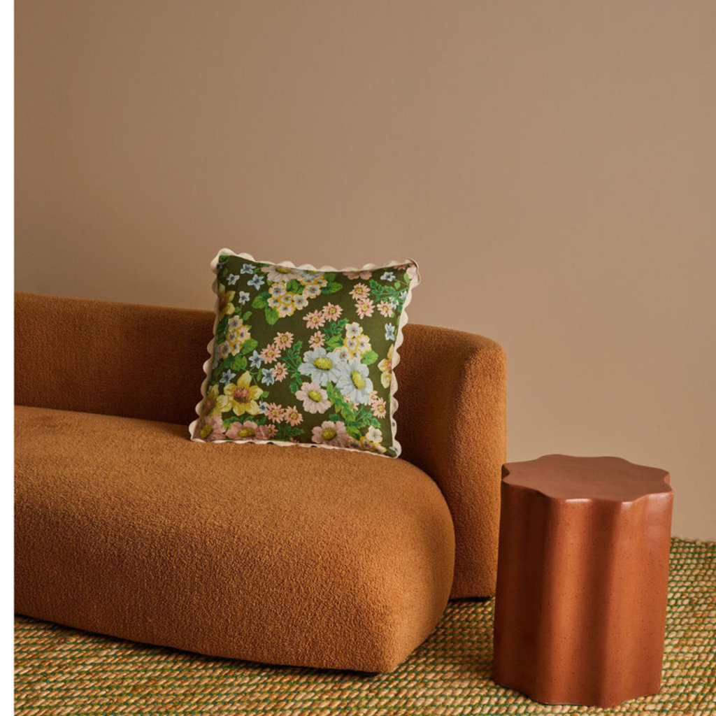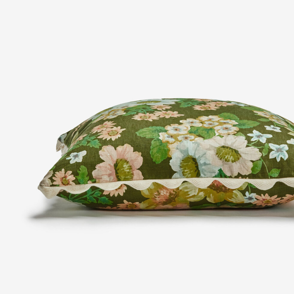 A rich olive green linen cushion featuring the delicate floral motifs of our Buttercup print. A grounding, garden-inspired layer that pairs beautifully with warm or neutral tones.