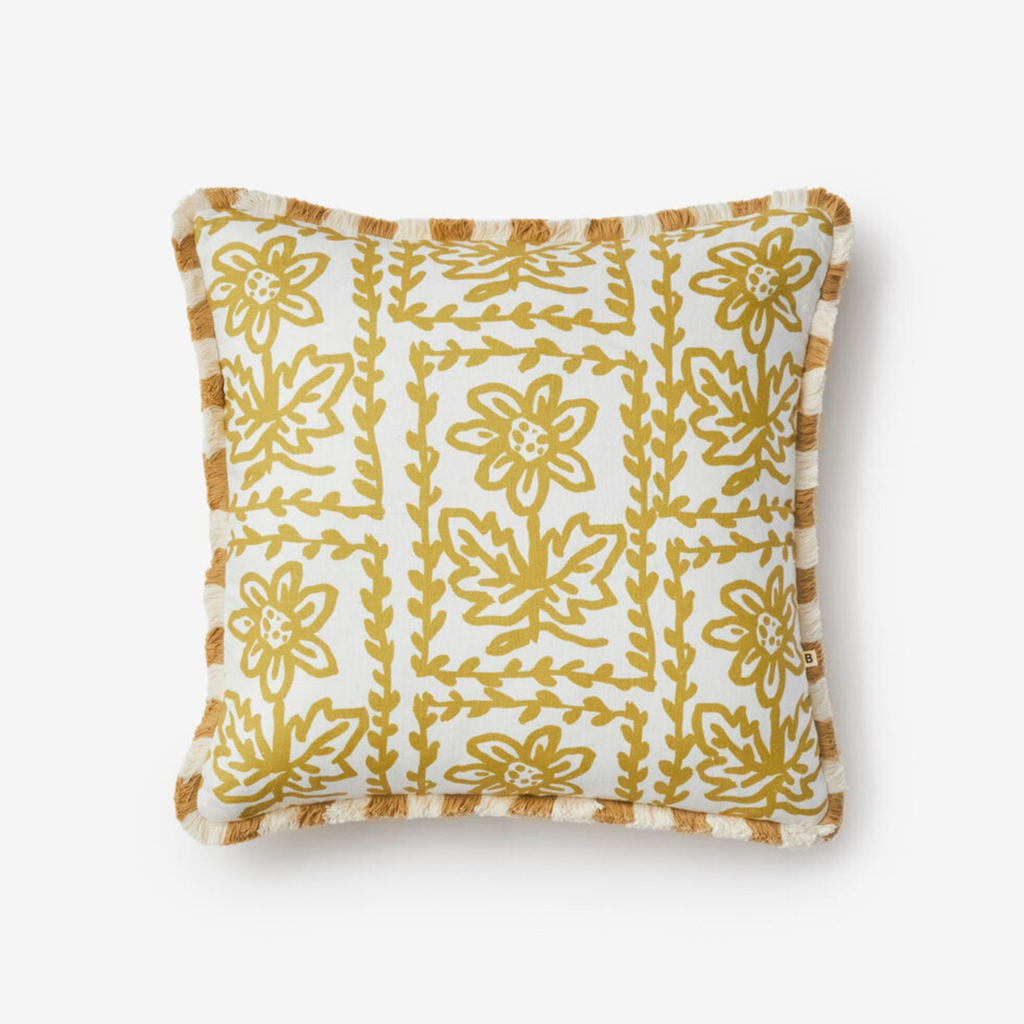 From In The Garden collection, this 50cm cushion is finished with a cream/tan fringe cotton trim and includes an ethically sourced plush feather insert.