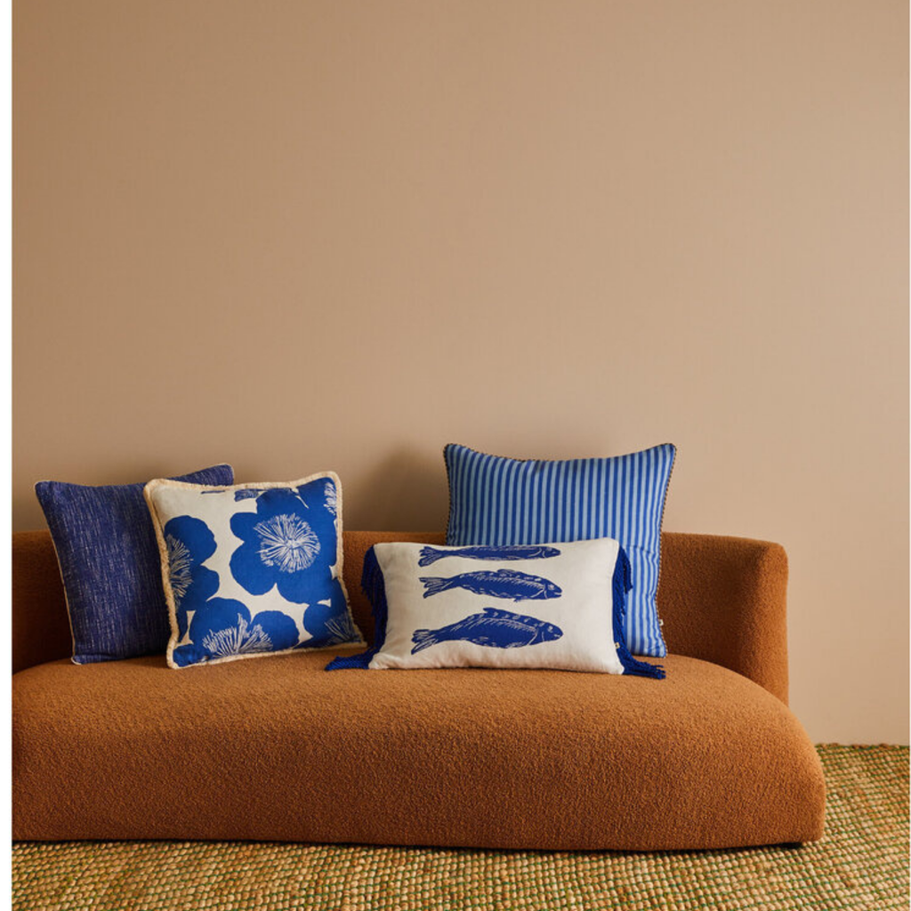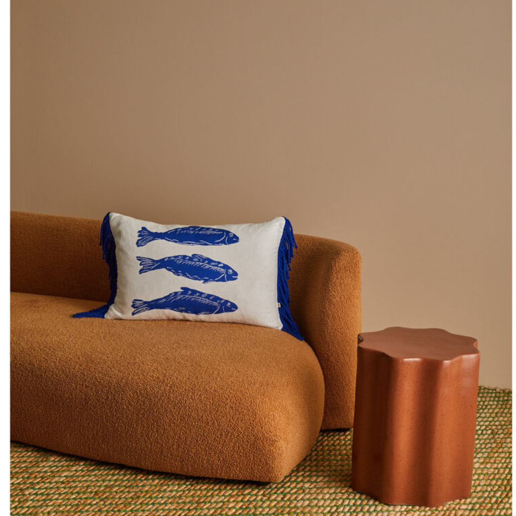 A playful linen cushion featuring hand-drawn tan sardines, finished with soft fringing. Light-hearted and unmistakably Mediterranean, this fish motif adds a coastal feel to any space.