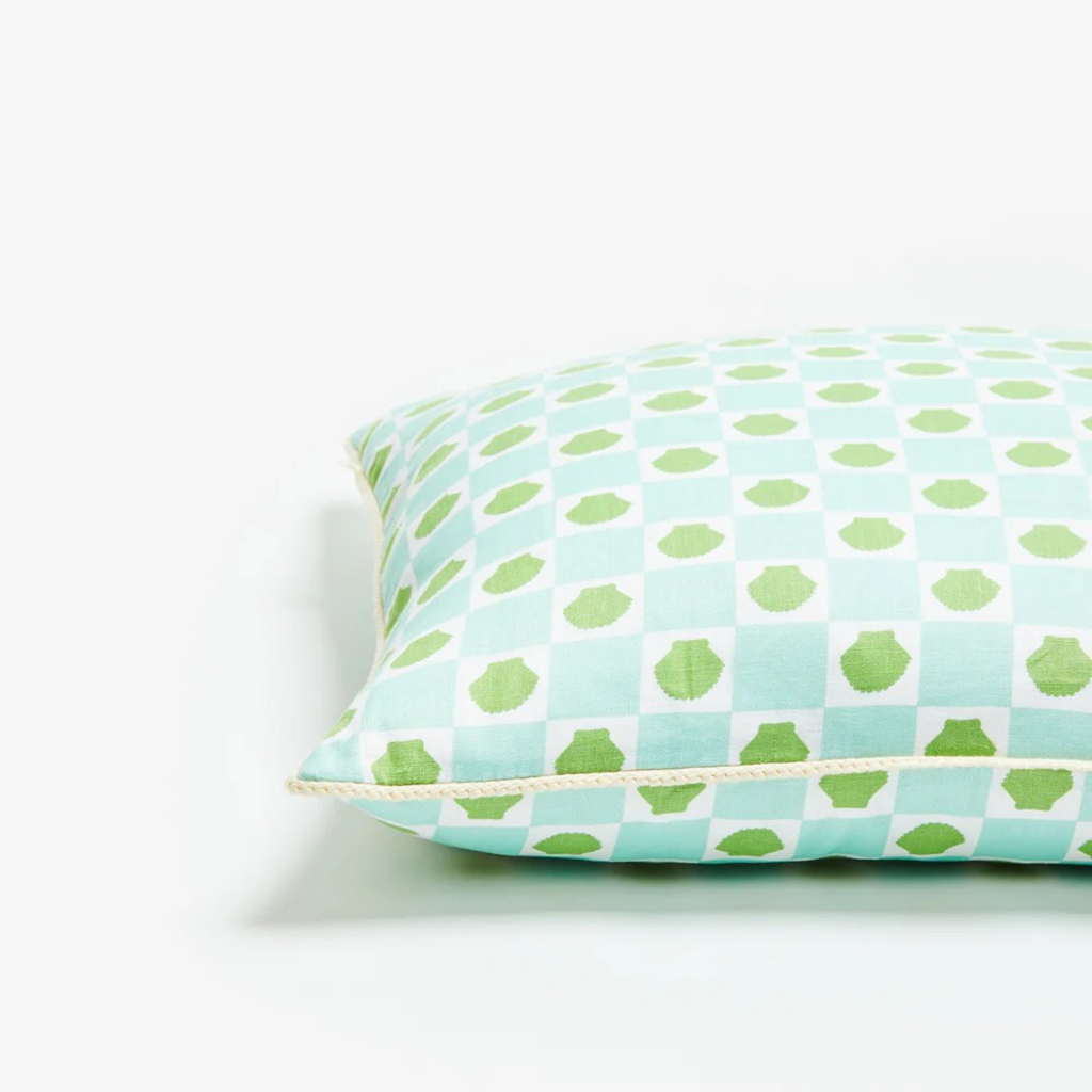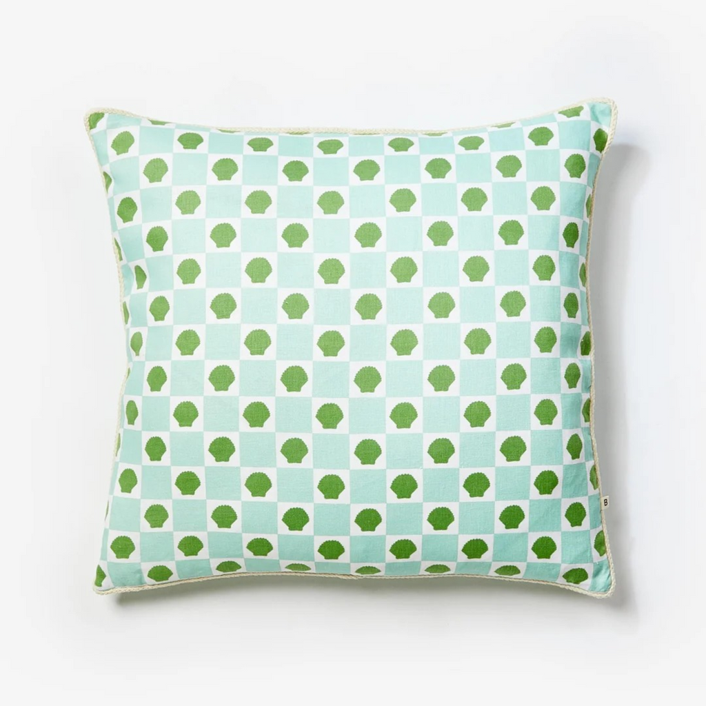 The Shell Check Mint 60cm cushion features original artwork by Bonnie printed on white linen. The reverse of the cushion features the same design.