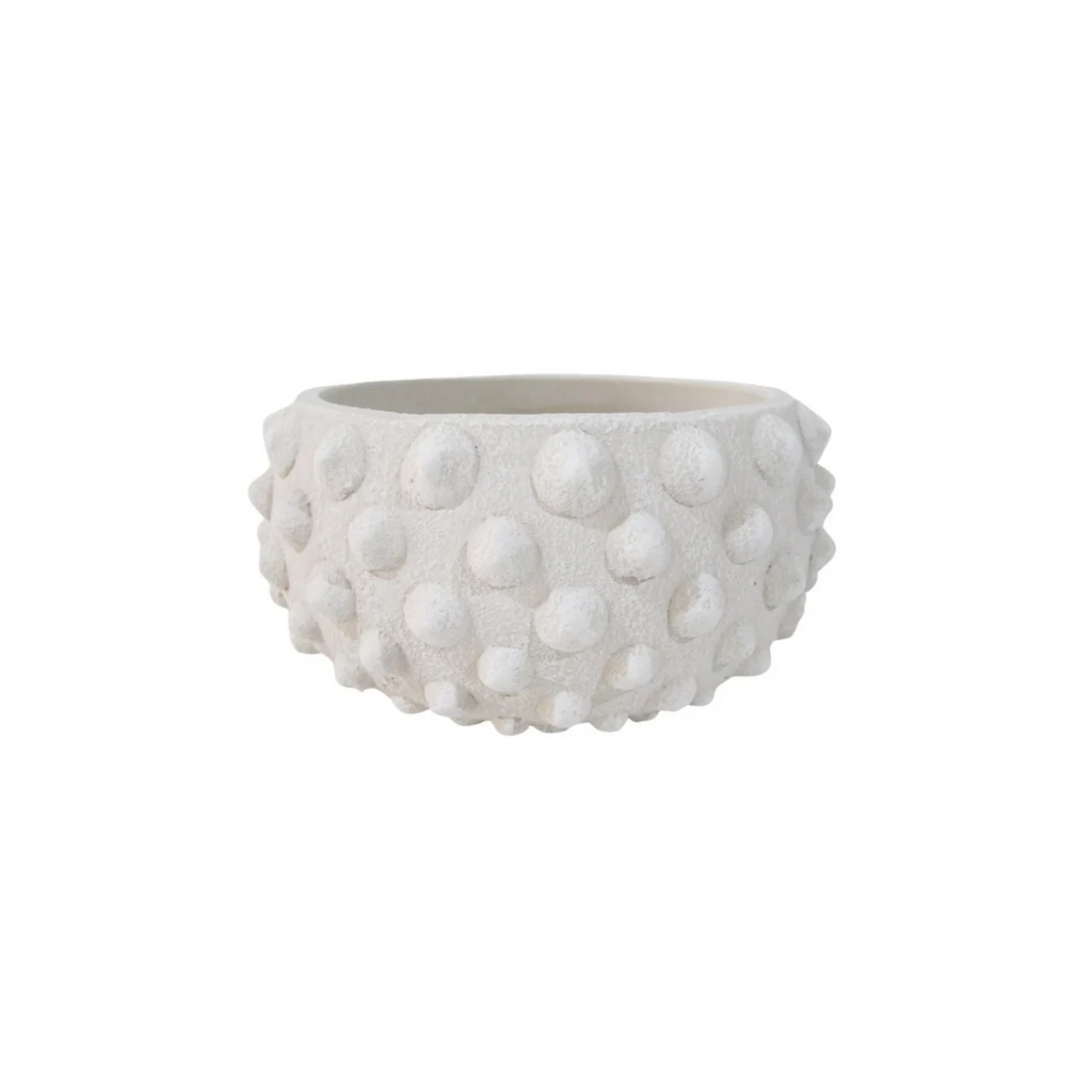 This bowl is both stylish and practical. Handcrafted from cement with a white appearance, it displays a large, oversized body. Its textured finish complements both classic and contemporary interiors alike, making it a visual statement piece.