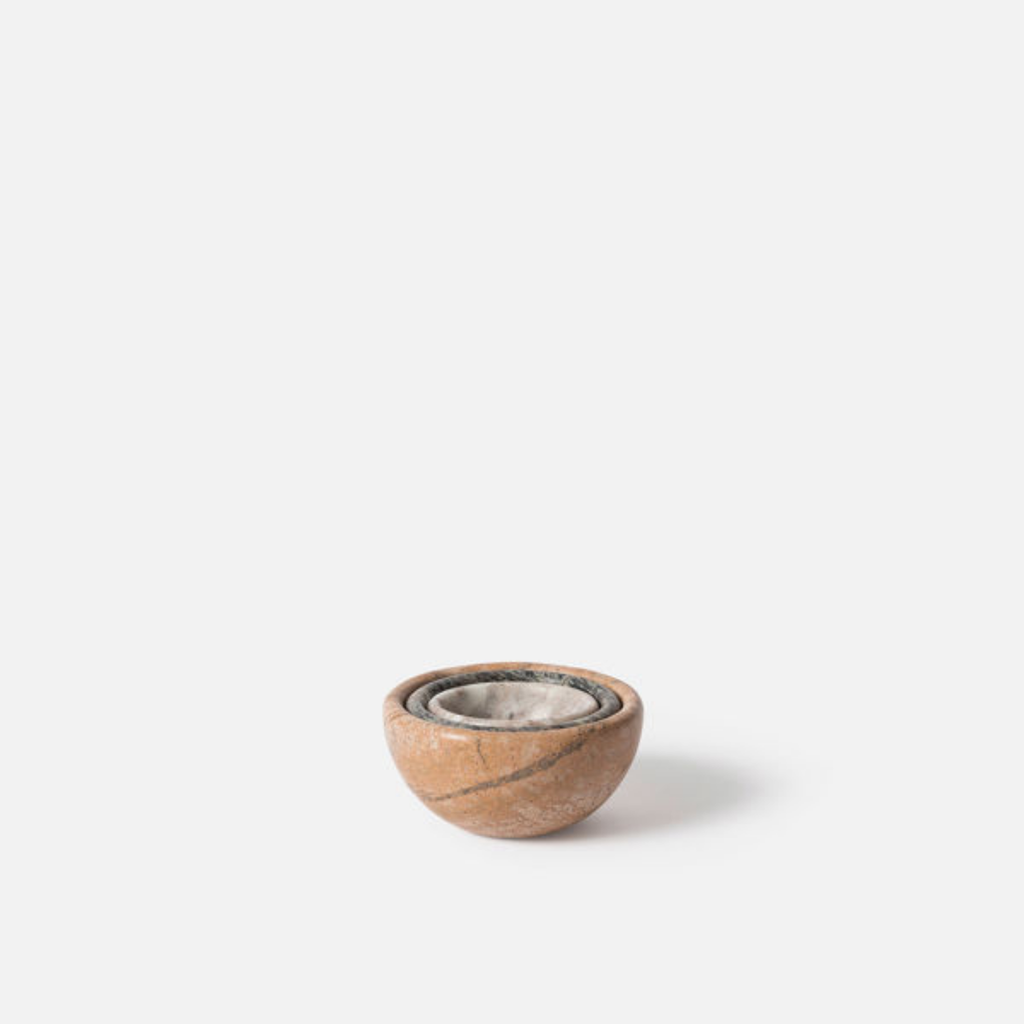 Form and function come together with the Terra Nesting Bowls. Each bowl perfectly nests into each other with the rounded lips forming three rings with contrasting materiality. The half-moon profile creates a light touch-point when displayed on a table.