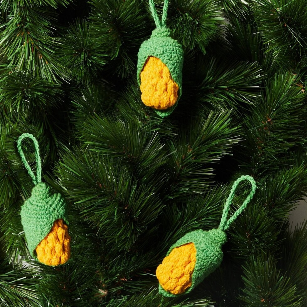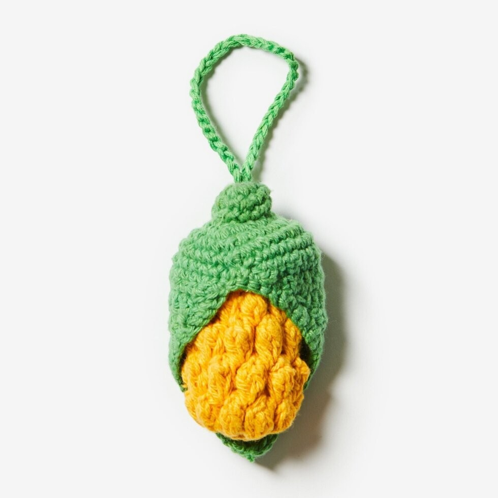 Celebrate Christmas in the southern hemisphere with this delightful hand-crocheted cotton ornament shaped like a sweet cob of corn. This design captures the spirit of sunny barbecues and outdoor gatherings, making it a perfect choice for the festive season down under. Hang this cutie with tropical accents and summer inspired decorations for a playful approach to festive decor.
