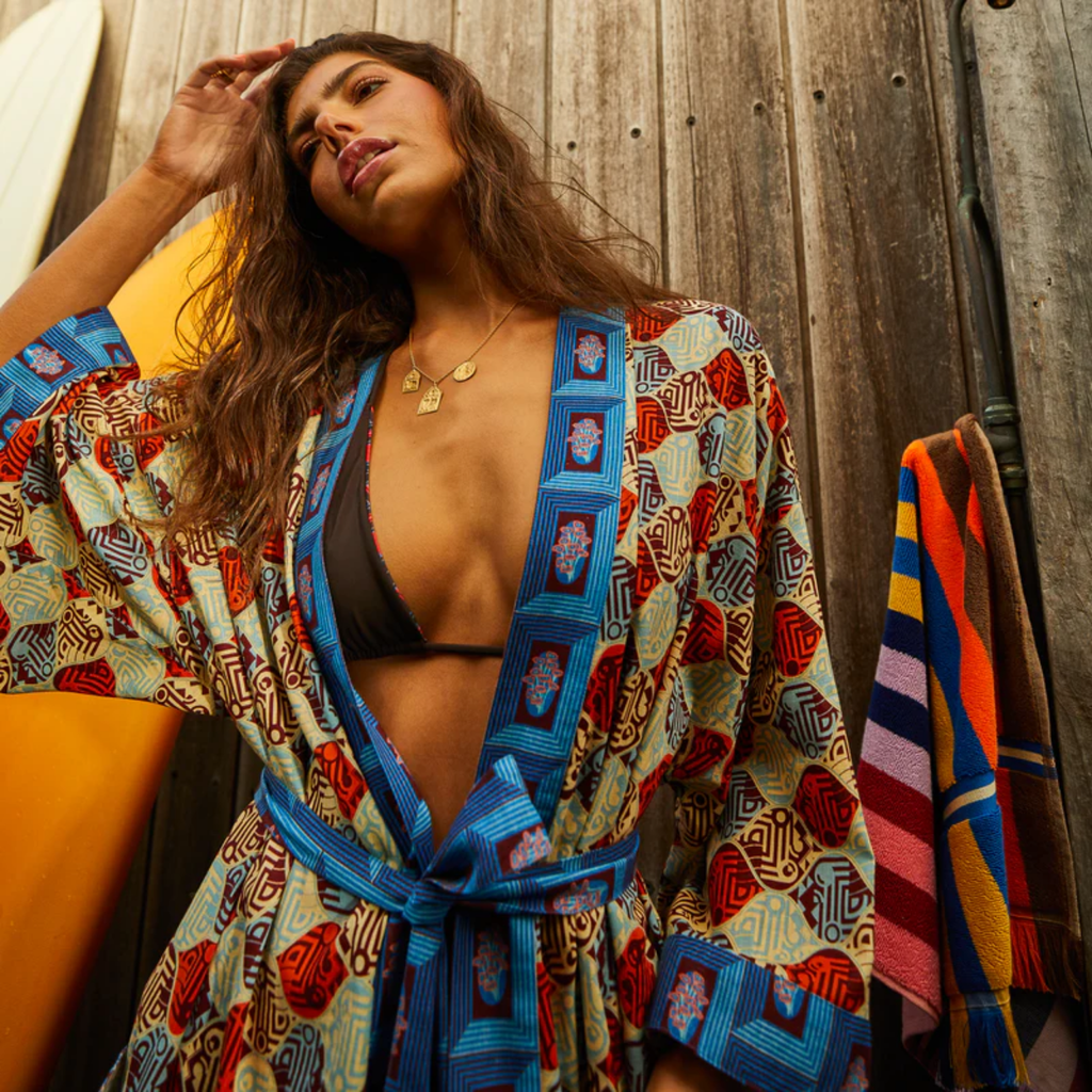 Breezy and effortless, this Lyocell-cotton robe is made for relaxed living. Light and breathable with an easy drape, it’s just as perfect to slip on post-shower as it is styled over bathers for a poolside cover-up. A Lyocell-cotton blend for a silky-soft feel, breathable comfort and a beautiful drape. Relaxed fit with wide, flowing sleeves for ultimate comfort. Colourful detailing delivers a considered maximalist aesthetic. The perfect layering piece - wear it over pyjamas, swimwear, or dress it up for a day out.