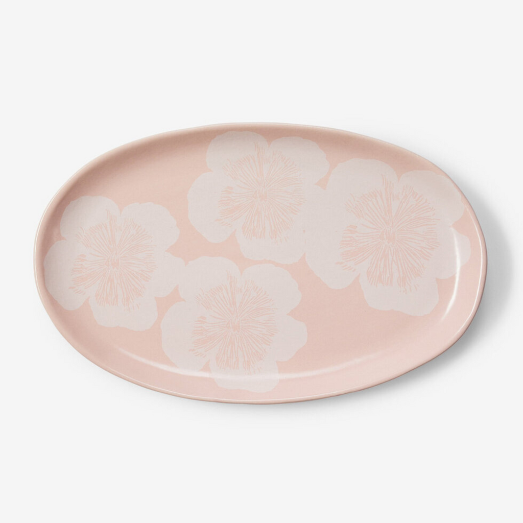 A ceramic oval plate with pretty floral design in pale pink. Ideal for platters, desserts, or centrepieces.