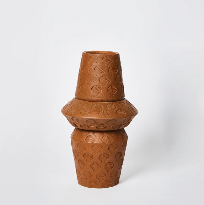 This wood fired terracotta vase is hand stamped with dandelion motifs. Style on its own or in combination with our speckled or coloured vase collections. This vase is sealed and can be used to display floral arrangements or styled as a sculptural piece.