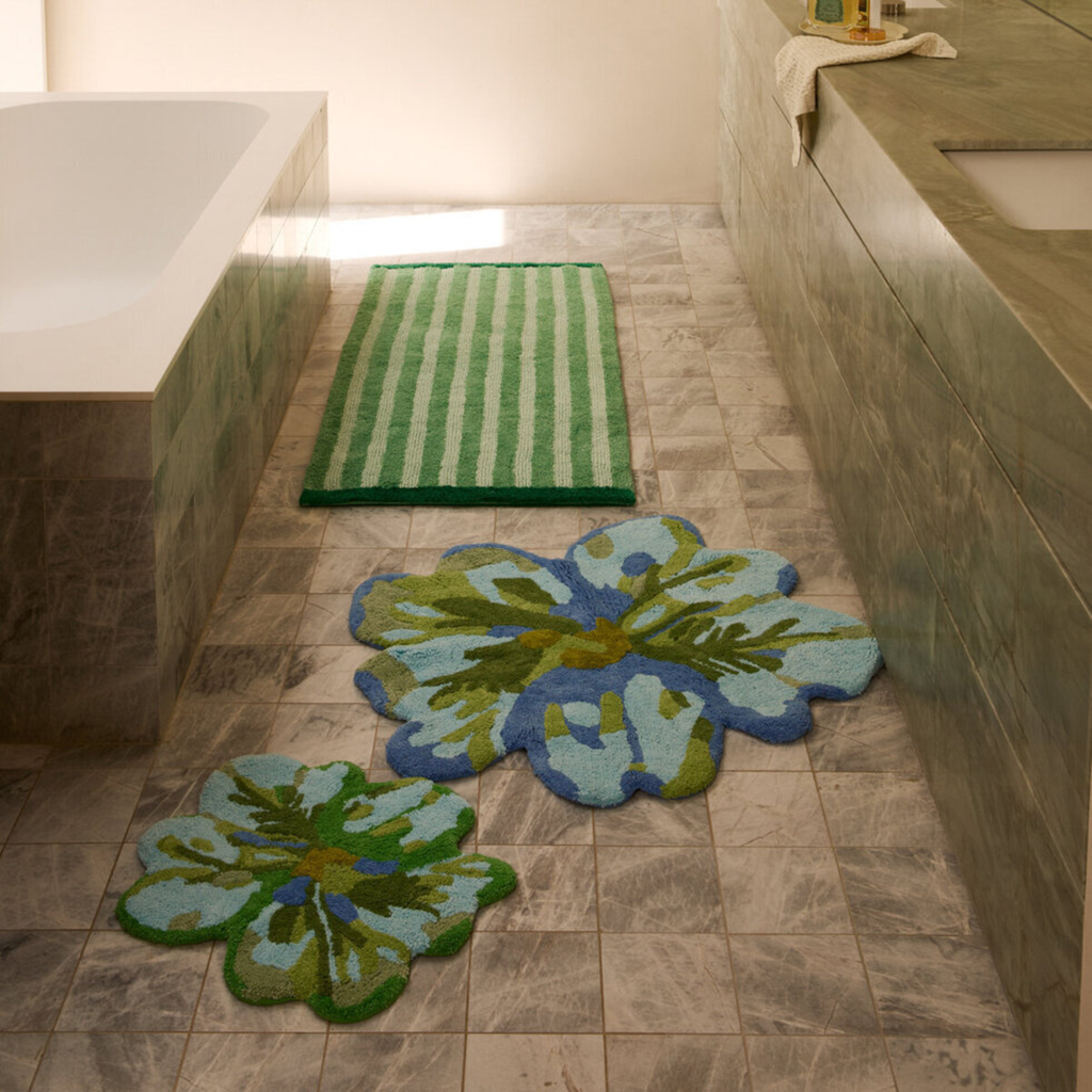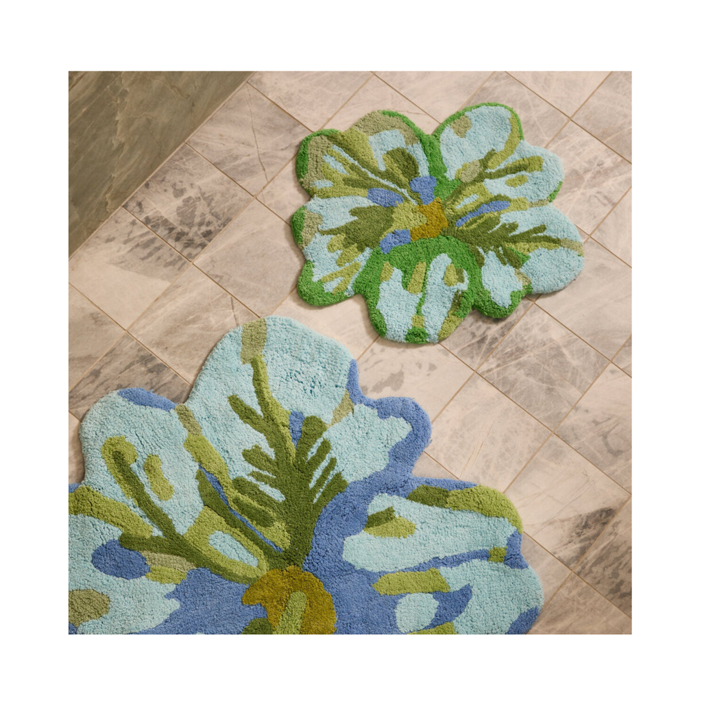 Blue and green tones define this tulip-shaped bath mat. Made from tufted cotton for softness and absorbency beside a bath or shower. Original artwork hand drawn by Bonnie with a soft and cushioned feel underfoot.