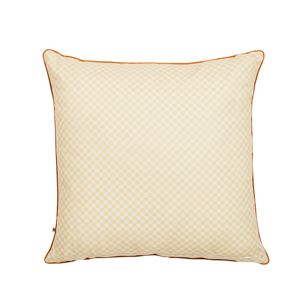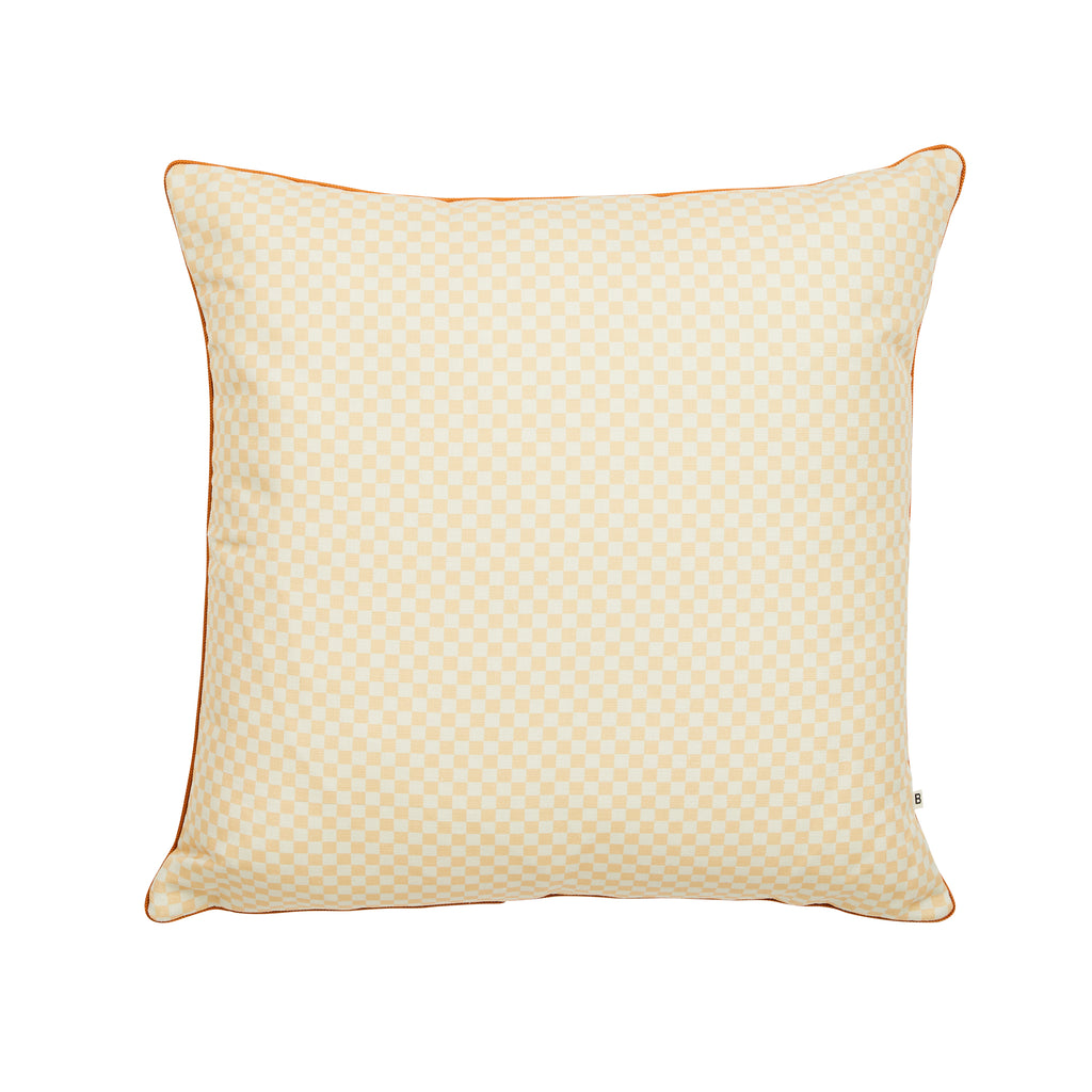 From the Dandelion collection, the Tiny Checkers Vanilla 60cm outdoor cushion features original artwork by Bonnie printed on water repellent linen and finished with tan piping. The reverse of the cushion features the same design.